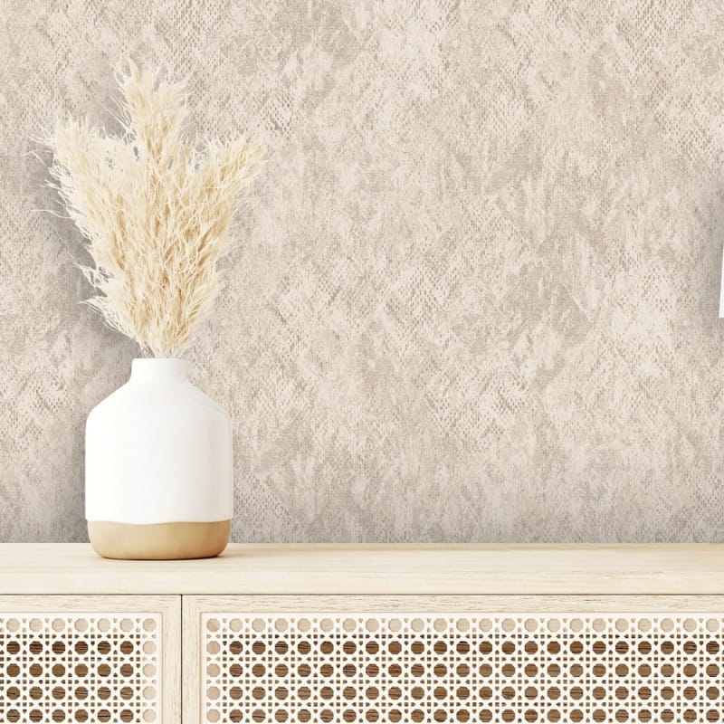 Vliestapete mit Vinyloberfläche, Design inspiriert von Schlangenhaut, Beige- und Graubeigetöne mit metallischen Akzenten.