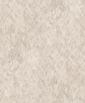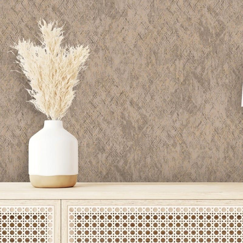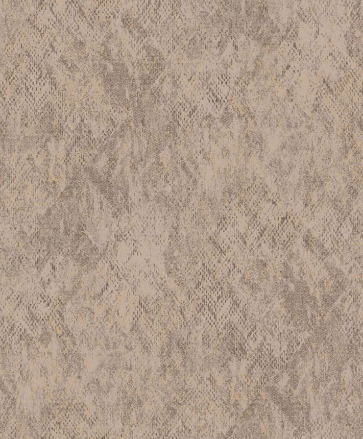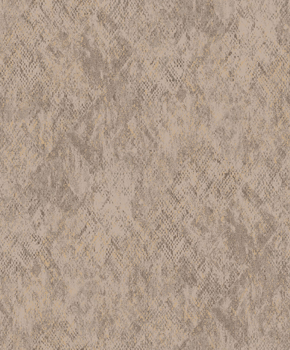 Vliestapete mit Vinyloberfläche, Design inspiriert von Schlangenhaut, Braun- und Braungrautöne mit metallisch-goldenen Akzenten.