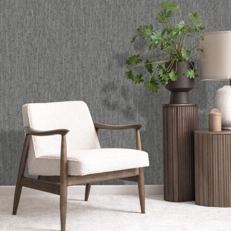 Vliestapete mit Vinyloberfläche, feine Struktur, natürliches Geflechtdesign in Dunkelgrautönen mit kleinen silbernen Details.