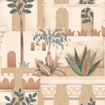 Vliestapete mit Vinyloberfläche, feiner Struktur, Sukkulenten und mediterranen Gebäuden in Braun-, Beige- und Schwarztönen.