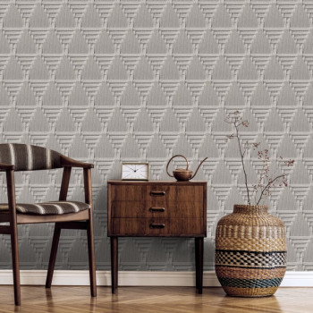 VliesVliestapete mit Vinyloberfläche, feiner Struktur, feiner Textur, geflochtenes Mattenmuster in Grautönen.