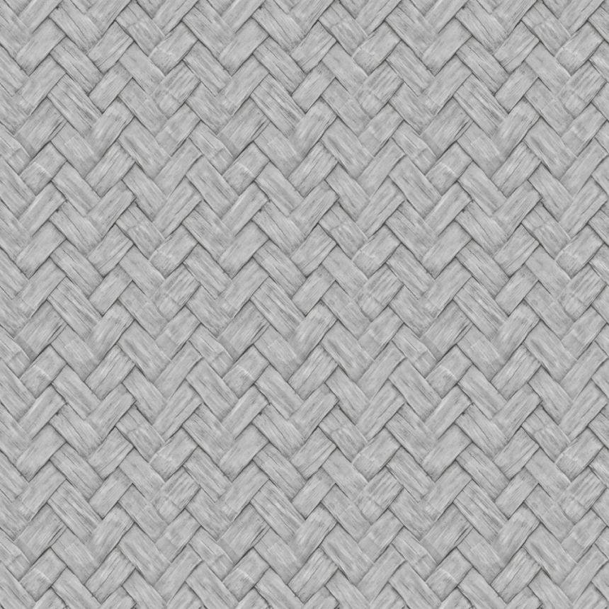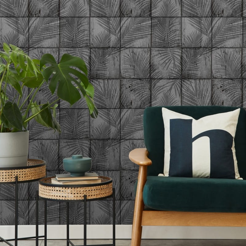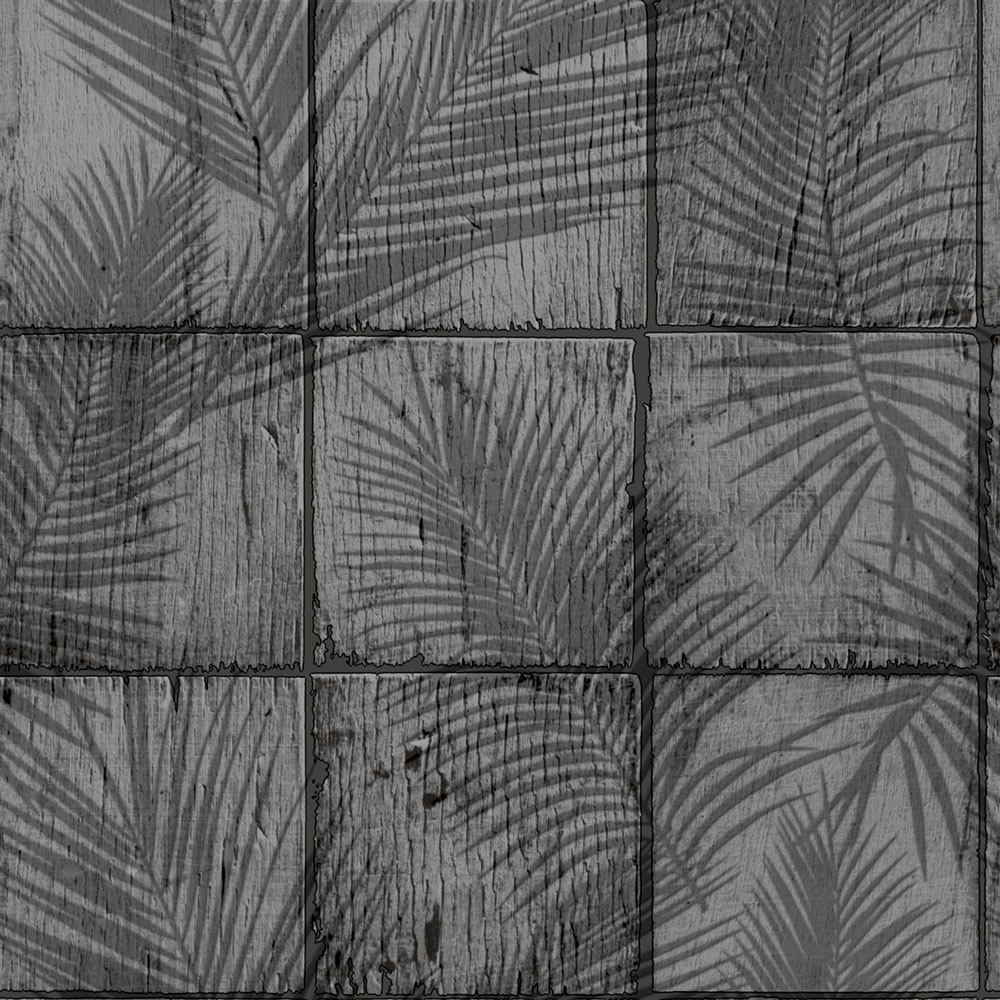 Grau-schwarze Vliestapete mit Vinyloberfläche, feine Textur, Holzvertäfelung mit Palmenblättern.