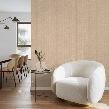 Vliestapete mit Vinyloberfläche, Fischgrätmuster in Braun-Beige-Tönen.