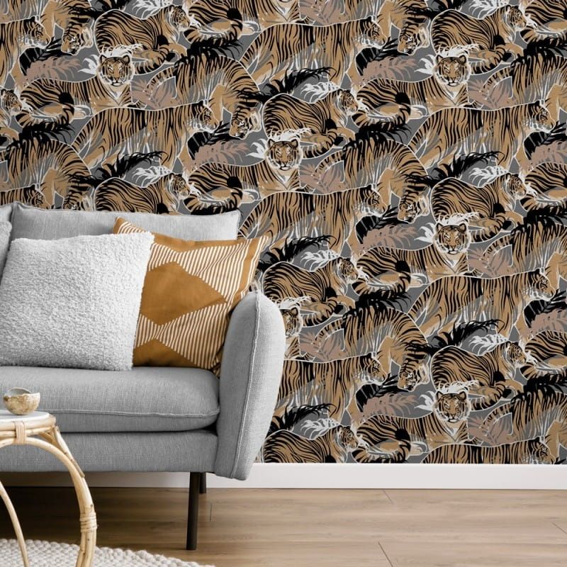 Vliestapete mit Vinyloberfläche, feiner Gewebestruktur, Tiger- und Palmblattmotiven, Grau- und Brauntönen.