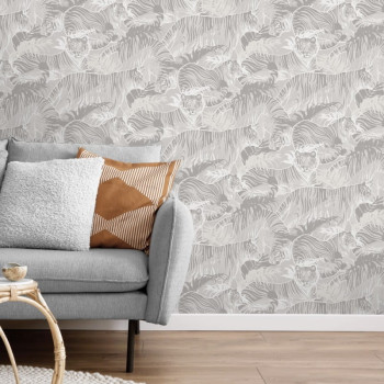 Vliestapete mit Vinyloberfläche, feiner Gewebestruktur, Tiger- und Palmblattmotiven, Grautöne.