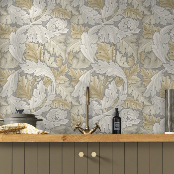 Vliestapete, Jugendstil-Blättermuster in Grau-, Braun- und Beigetönen.