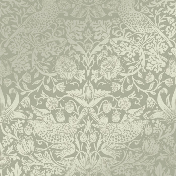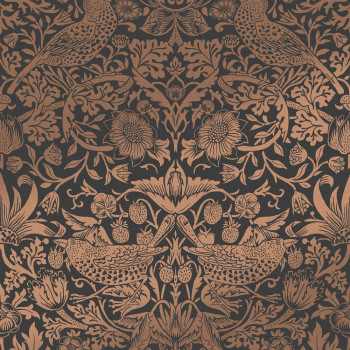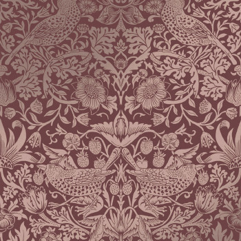 Vliestapete, reiches Ornamentmuster mit Blumen, Blättern, Vögeln und Erdbeeren, Farbtöne von Lila, Ziegelrot, Braun und Grau.