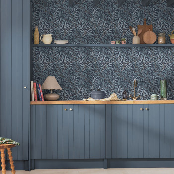 Vliestapete, reiches Muster mit Zweigen in Blau- und Brauntönen.