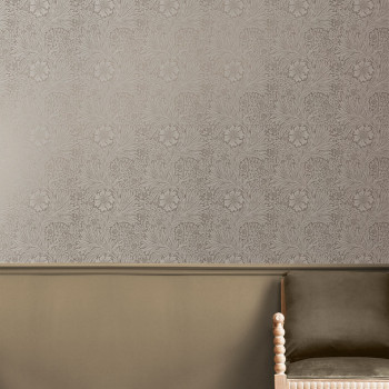 Halbglänzende Vliestapete, reiches florales Ornamentmuster in Graubeige-Tönen und metallischem Glanz.