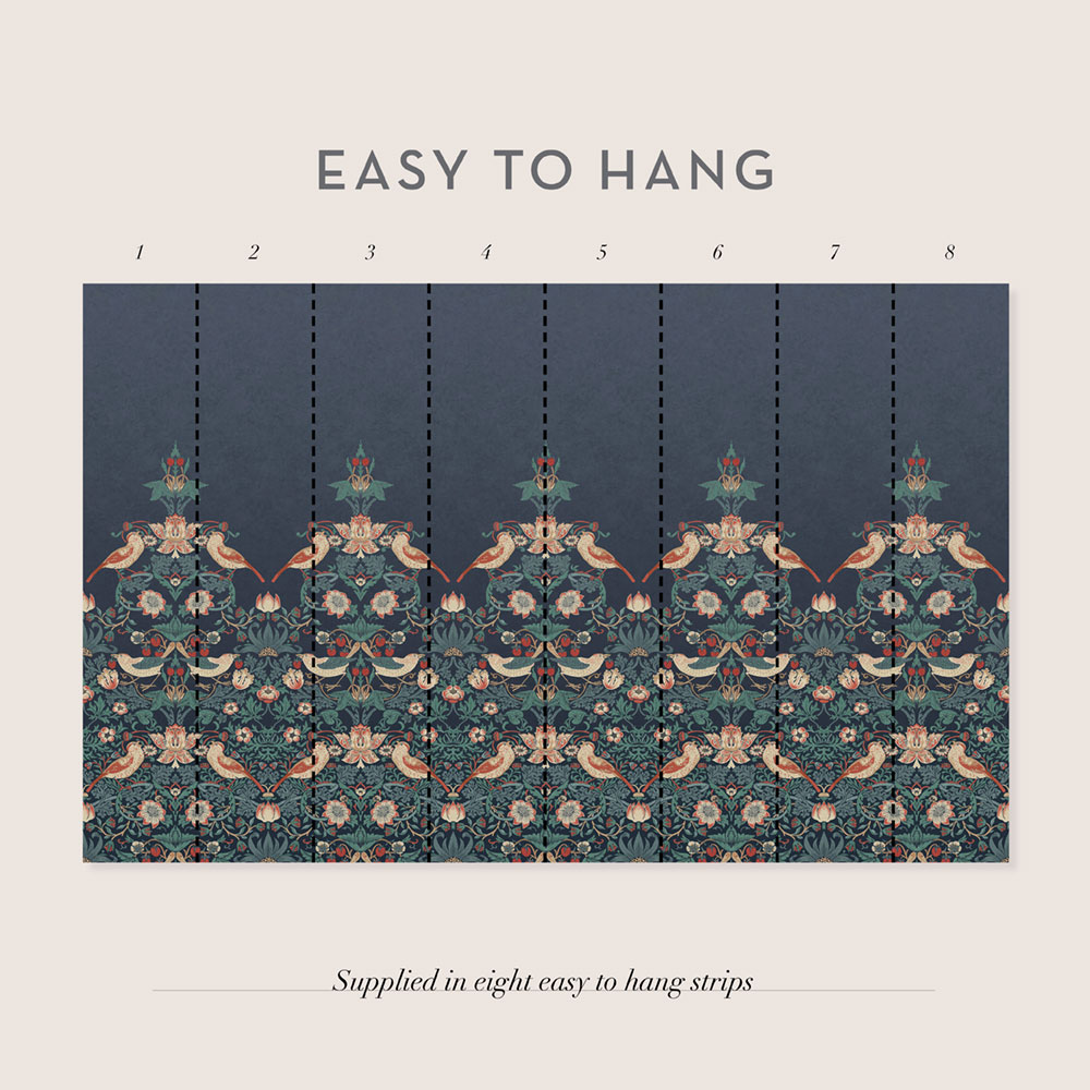 Vliestapete Wandbilder, reiches Ornamentmuster mit Blumen, Blättern, Vögeln und Erdbeeren, Blau-, Grün-, Ziegelrot- und Beigetöne.