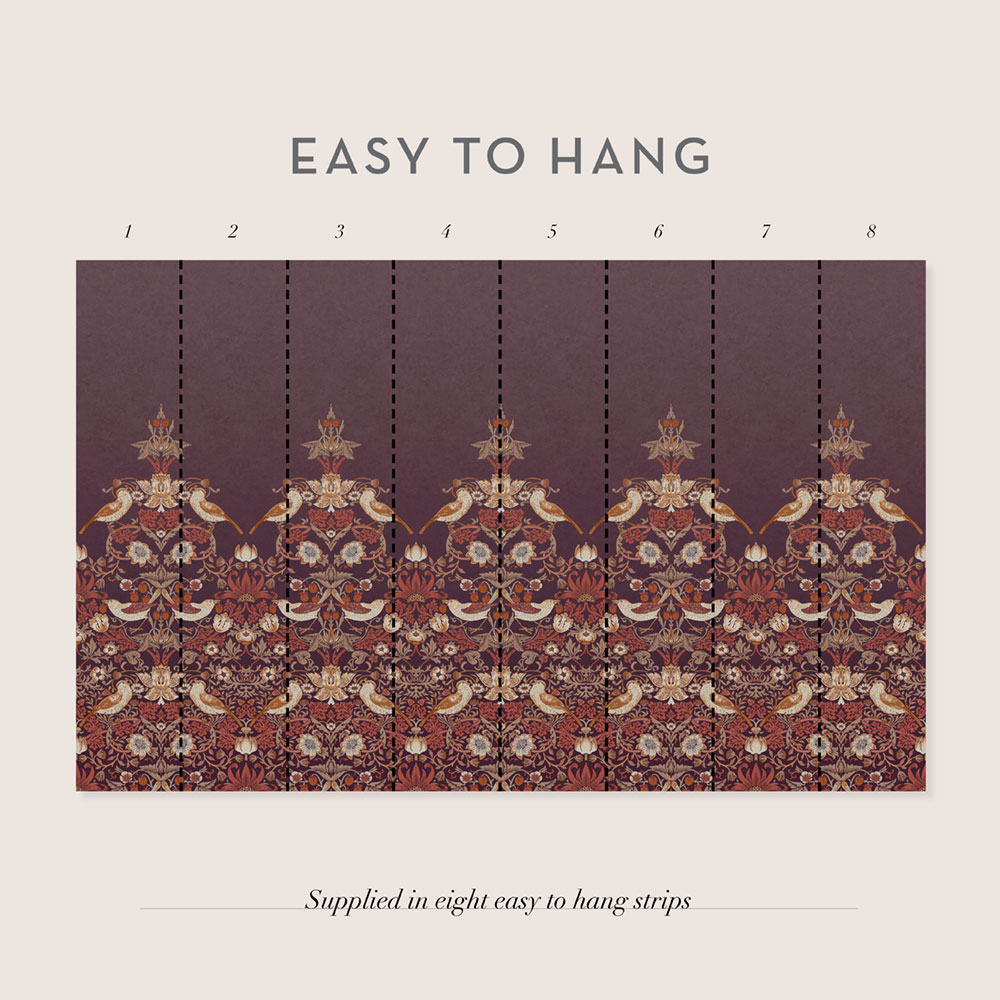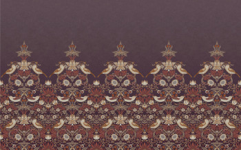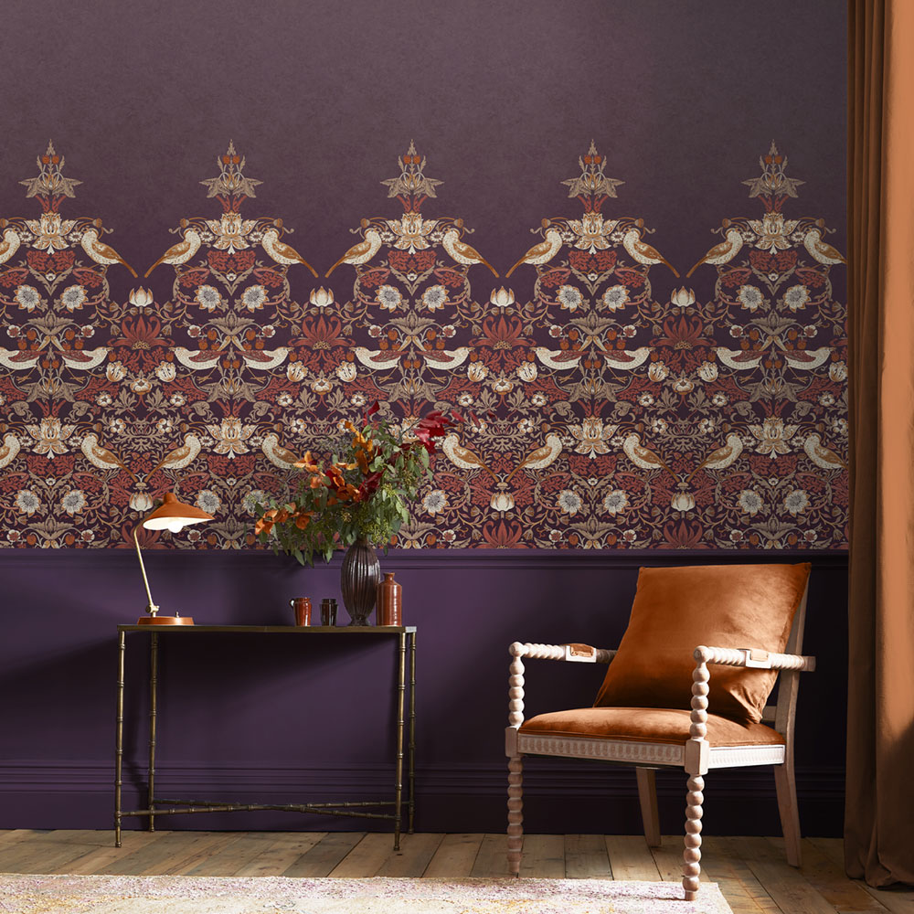 Vliestapete Wandbilder, reiches Ornamentmuster mit Blumen, Blättern, Vögeln und Erdbeeren, Burgunder-, Braun-, Beige- und Orangetöne.