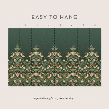 Vliestapete Wandbilder, reiches Ornamentmuster mit Blumen, Blättern, Vögeln und Erdbeeren, Grün-, Rosa- und Ockertöne.