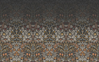 Vliestapete Wandbilder, reiches florales Ornamentmuster in Schwarz-, Grau-, Orange- und Brauntönen.