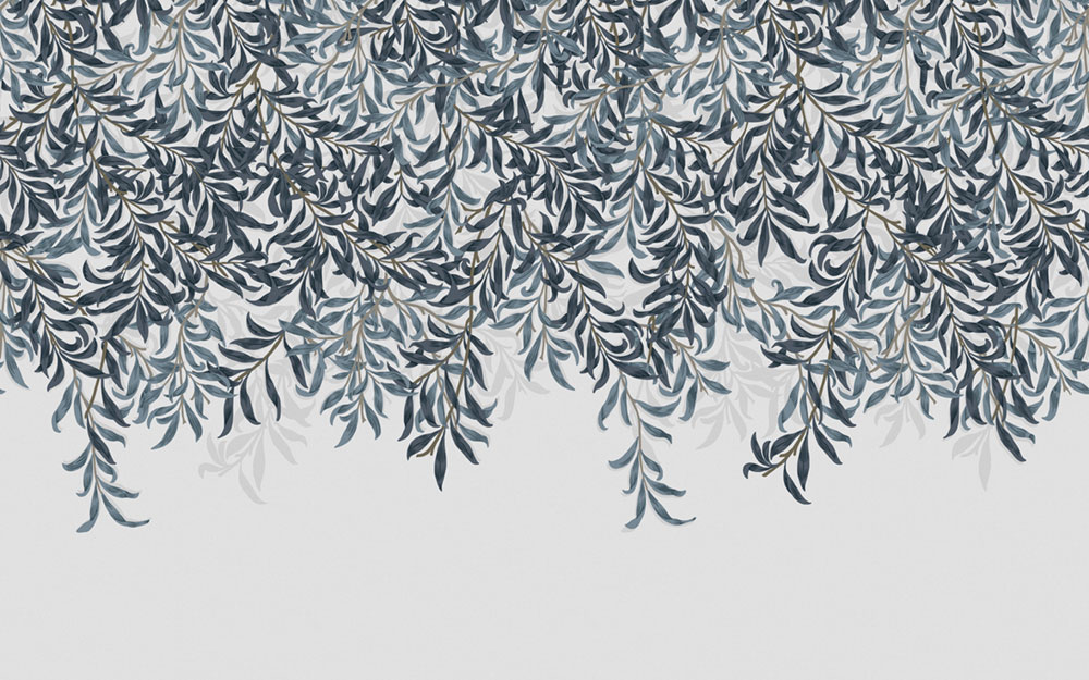 Vliestapete Wandbilder, reiches Muster mit Zweigen in Blautönen.