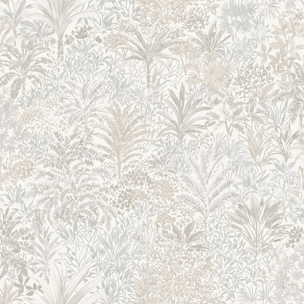 Geprägte, halbglänzende Vliestapete mit Vinyloberfläche, Motive ttropischer Bäume und Blätter, Farbtöne in Creme, sanftem Grau und Beige.