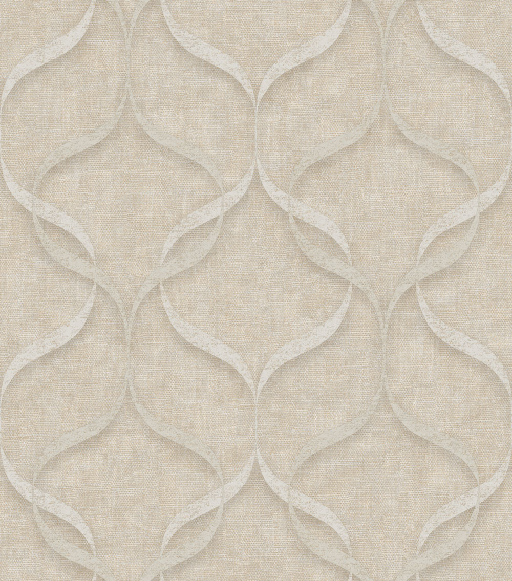 Sanft geprägte Vliestapete mit Vinyloberfläche, Imitation von gröberem Gewebe in Graubeige-Tönen, Ornamentmuster in Matt und dezentem Glanz.