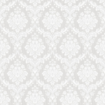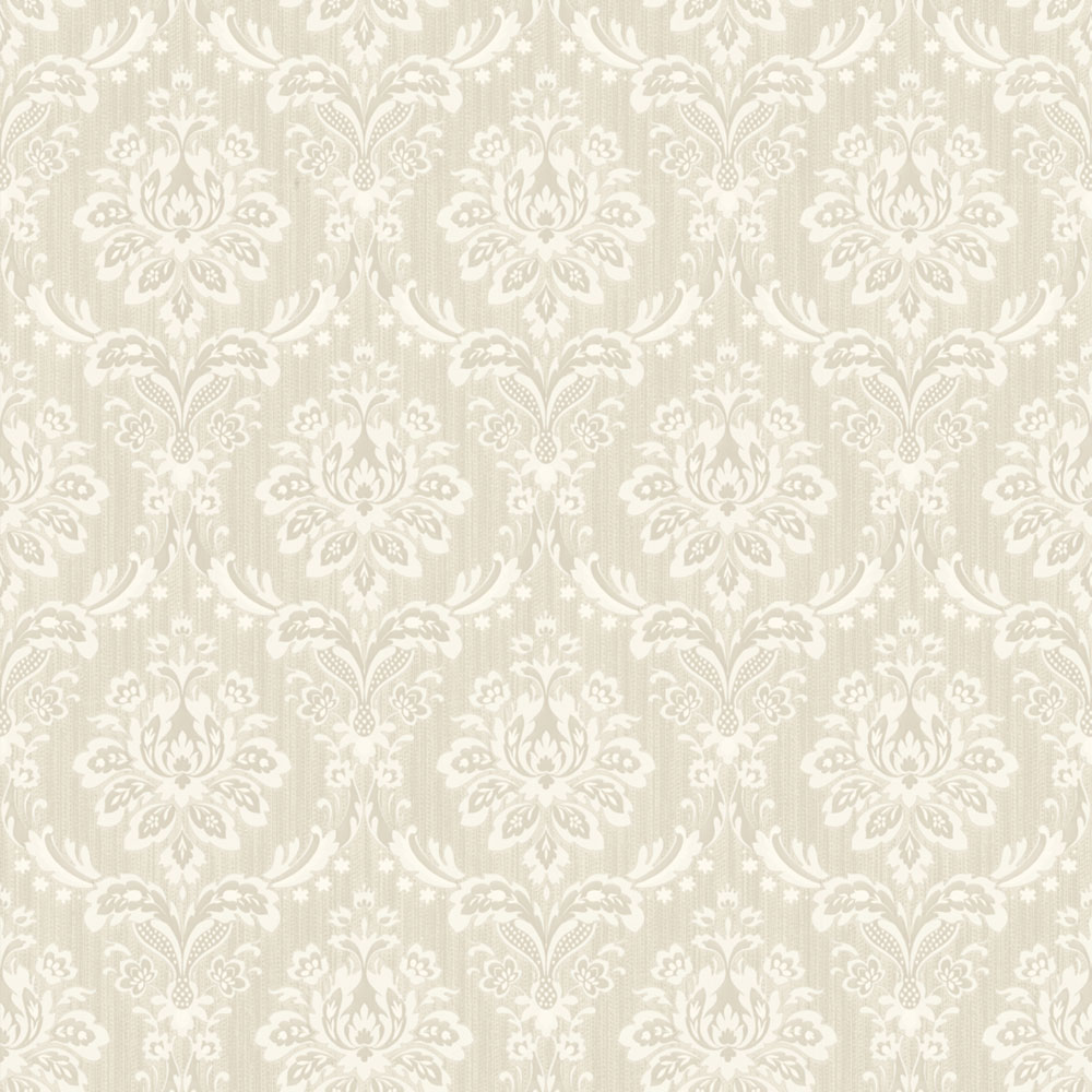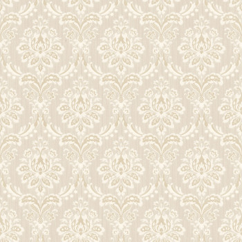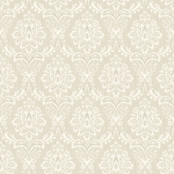 Sanft geprägte, halbglänzende Vliestapete mit Vinyloberfläche, Barockmuster in Creme- und Beigetönen.