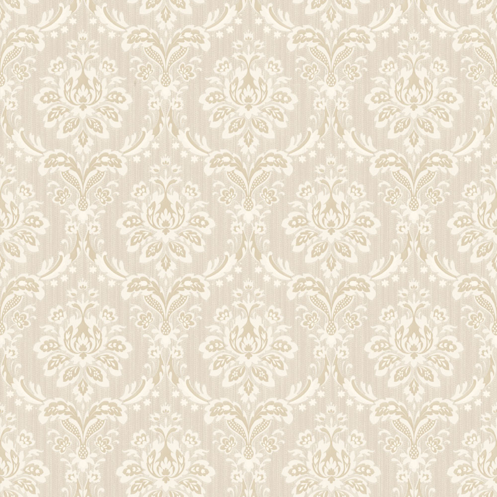 Sanft geprägte, halbglänzende Vliestapete mit Vinyloberfläche, Barockmuster in Creme- und Beigetönen.