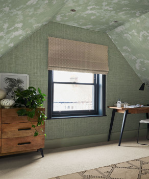 Glatte Vliestapete, grobes Naturmatten-Motiv in Salbeigrün-Tönen.