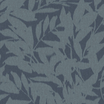 Vliestapete, Blättermotive in Blautönen, der Hintergrund erinnert an eine Stoffstruktur.