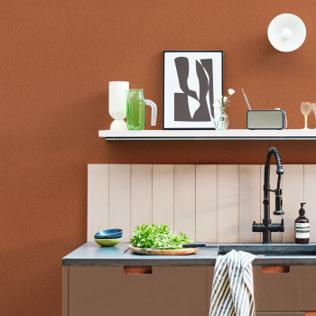 Glatte Vliestapete, Design imitiert Stoffstruktur in Terrakotta-Braun-Tönen.