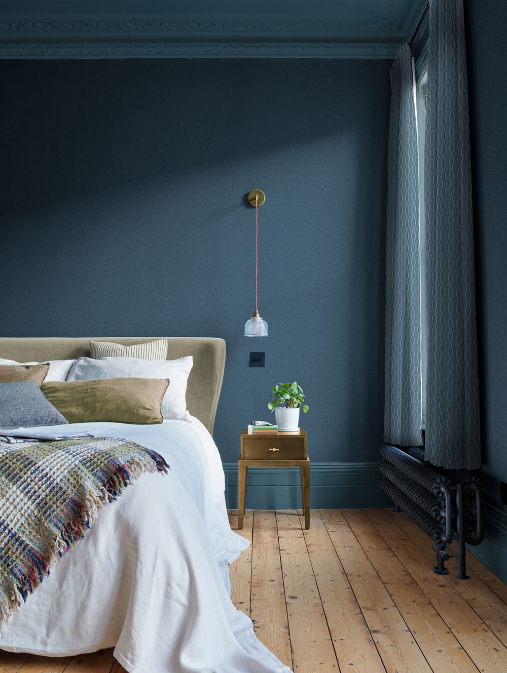 Glatte Vliestapete für die Wand, stoffähnliche Struktur in dunkelblauen Tönen.
