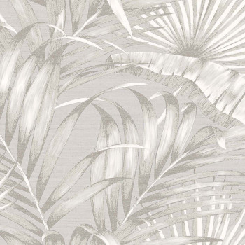 Luxuriöse, geprägte Vliestapete mit Vinyloberfläche, Grautöne, tropische Blätter mit perlmuttfarbenem Halbglanz.