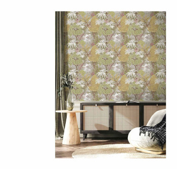 Vliestapete, Pflanzenmotive in Grün-, Ocker-, Beige-, Grau- und Burgundertönen.