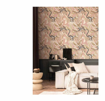 Vliestapete, Lemuren- und Blattmotive in Ocker-, Beige- und Schwarztönen auf einem Vintage-Pink-Hintergrund.