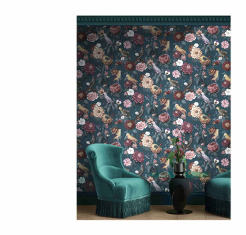 Vliestapete, Blumen- und Papageienmotiv, Blau-, Altrosa-, Burgunder-, Braun- und Grüntöne.
