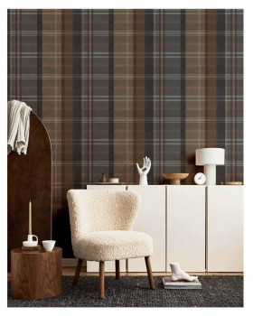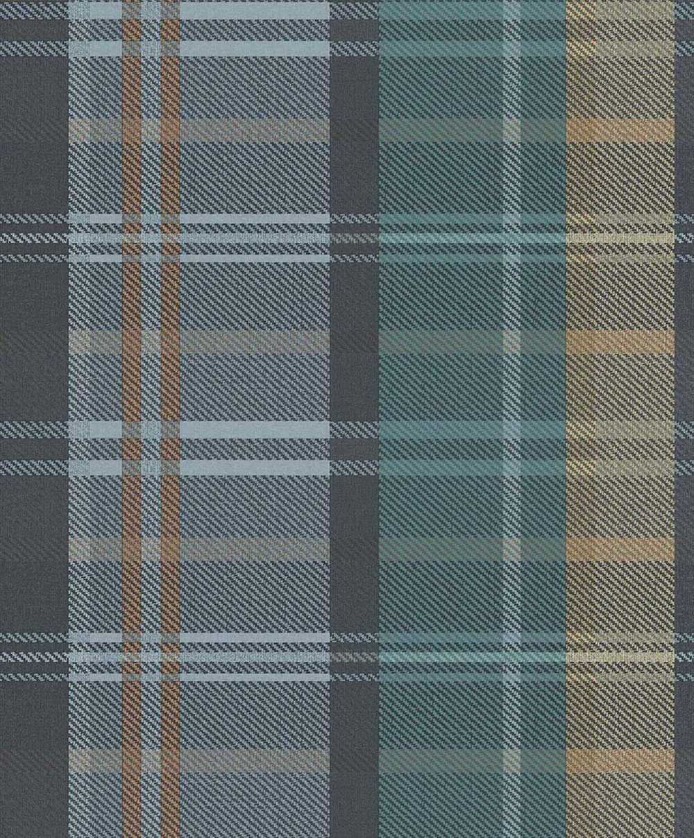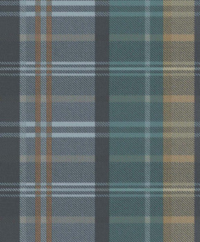 Vliestapete, Schottenstoff-Imitat in Türkis-, Blau- und Braun-Bronze-Tönen.