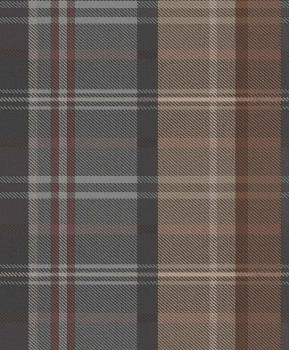 Vliestapete, Schottenstoff-Imitat in Braun-, Schwarz-, Grau- und Burgundertönen.