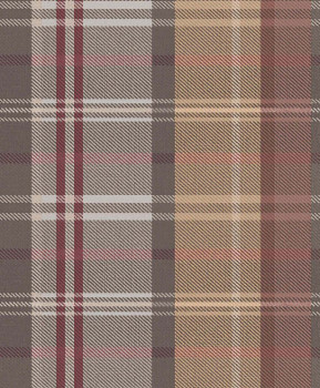 Vliestapete, Schottenstoff-Imitat in Braun-, Beige-, Grau- und Burgundertönen.