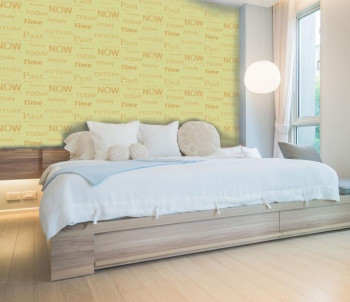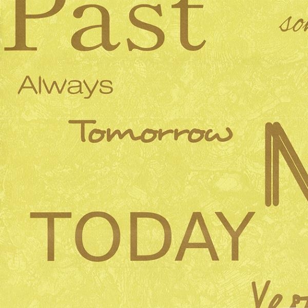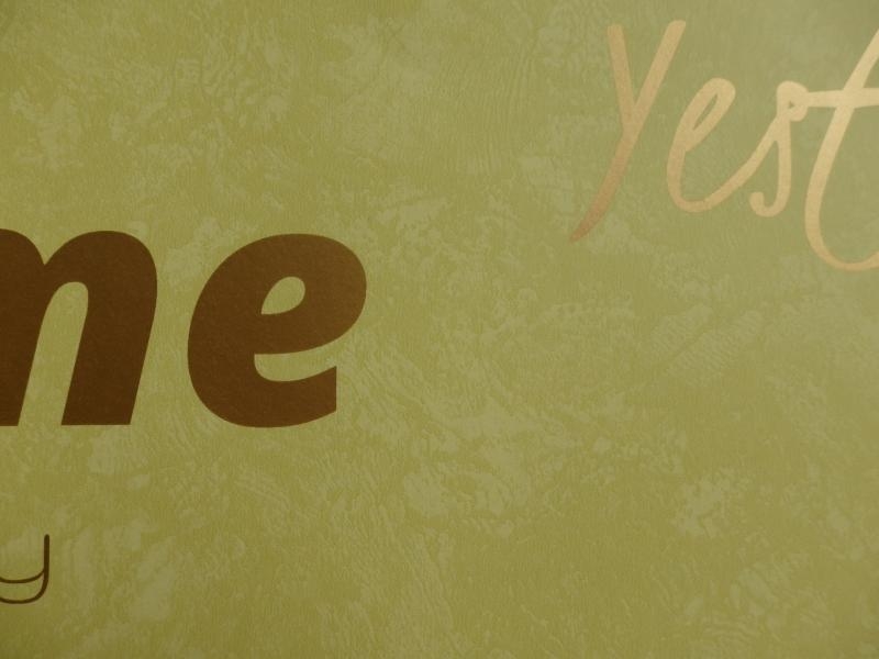 Vliestapete. Goldbeschriftung auf Limettegrüner Tapete.