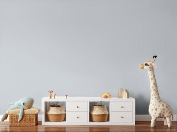 Vliestapete, feine Struktur erinnert an Leinenstoff, zartblaue Farbtöne.