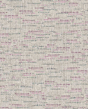 Vliestapete, Imitation von gröberem Stoff in Grau-Braun-Beige-, Lila- und Türkistönen, deutlich geprägte Textur.