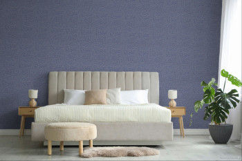 Vliestapete, Imitation von gröberem Stoff in Blautönen, manchmal Lila, deutlich geprägte Textur.