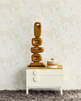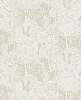 Vliestapete, Blatt- und Baummotive in Beigetönen.