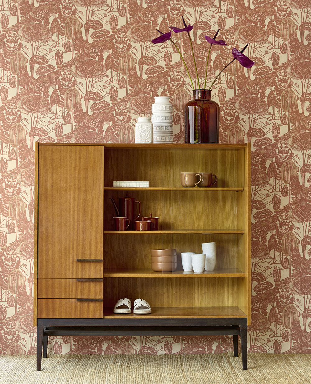 Vliestapete, Blatt- und Baummotive in Beige- und Ziegelrottönen.