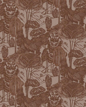 Vliestapete, Blatt- und Baummotive in Braun- und Ziegelrottönen.