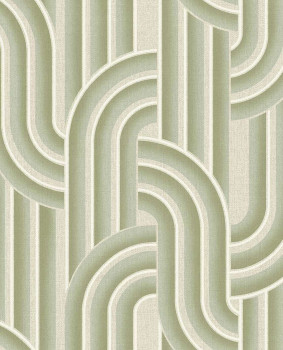 Vliestapete, grafisches Retromuster in Grün- und Beigetönen, feine Struktur.