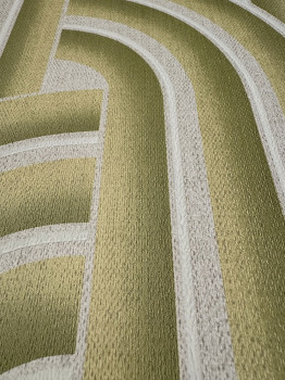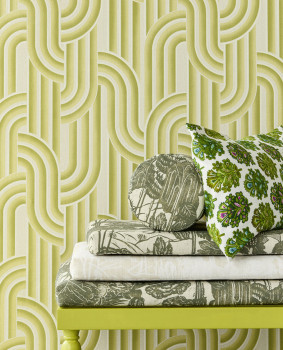 Vliestapete, grafisches Retromuster in Grün- und Beigetönen, feine Struktur.