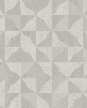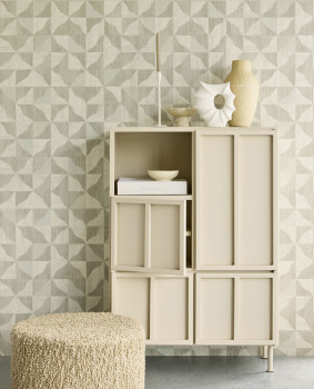 Vliestapete mit Vinyloberfläche, geometrischem Muster, gröberer Struktur, halbglänzenden Graubeige-/Sandtöne.