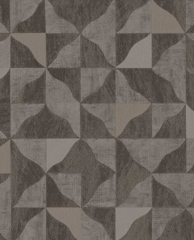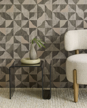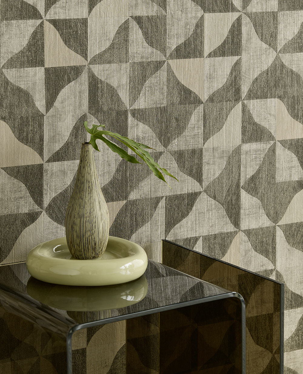 Vliestapete mit Vinyloberfläche, geometrischem Muster, gröberer Struktur, halbglänzenden Grau-, Braun- und Graubrauntönen.