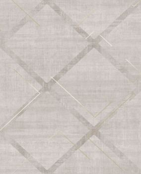 Vliestapete, geometrisches Muster in matten Graubeigetönen, metallisch goldene Linien, ezent geprägte Textur.
