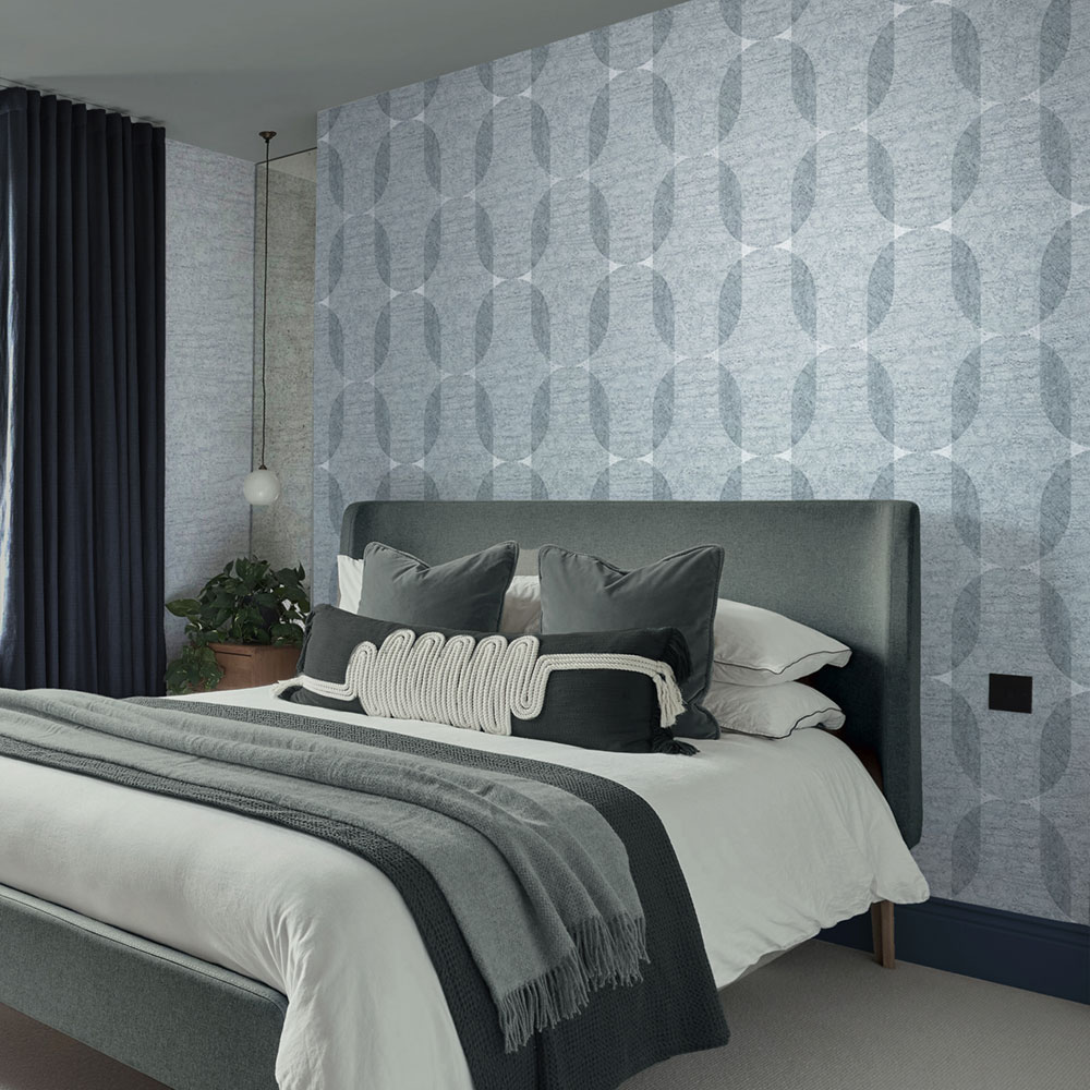 Vliestapete, grafisches Muster, Metallic-Halbglanz, Blautöne.