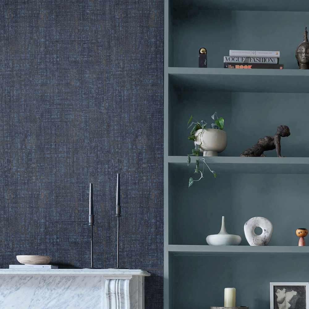 Glatte Vliestapete, strukturiertes Design in Dunkelblautönen, durchscheinende Brauntöne.