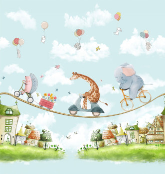 Vliestapete, Kindermotive von reisenden Tieren, hellblauer Hintergrund.