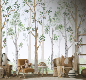 Vliestapete, Baum-, Waldmotive, Braun-, Grün-, Grautöne.