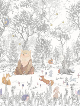Vliestapete, Waldtiermotiv, Grau-, Braun- und Blautöne.